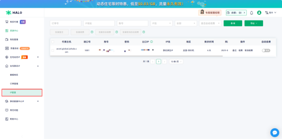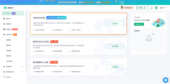 进入「IPHALO官网」,注册账号后登录后台,根据代理需求选择「住宅动态IP」/「住宅静态IP」/「静态数据中心IP」的服务,选择需要进行代理的国家/地区IP,并完成对应代理IP套餐的购买;